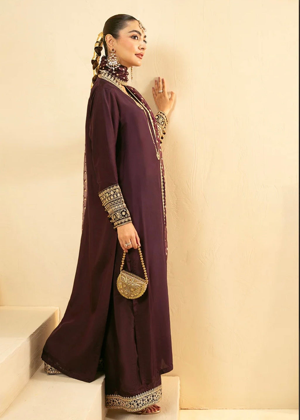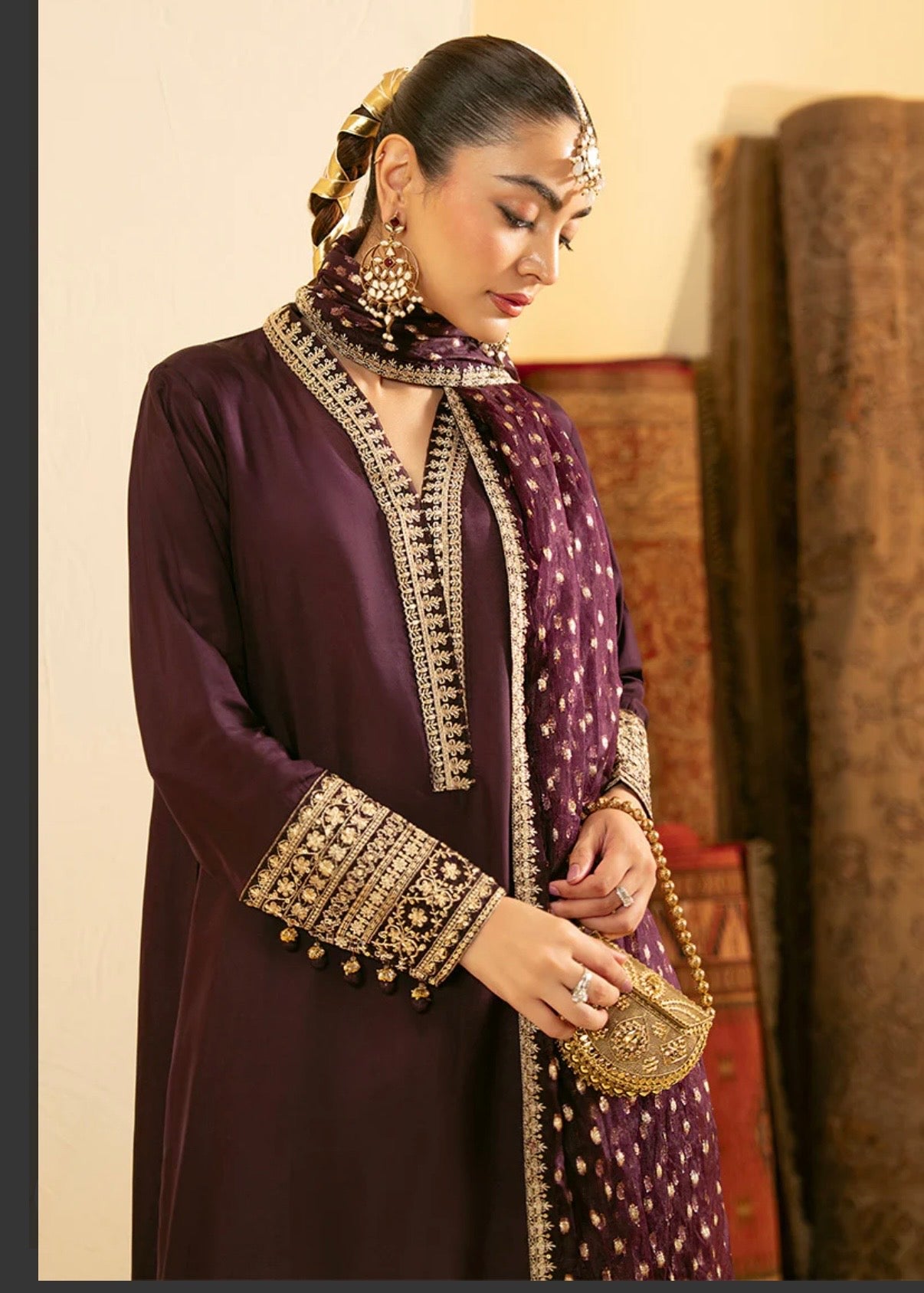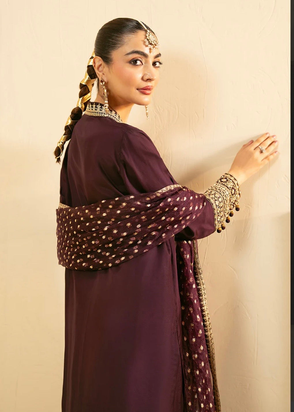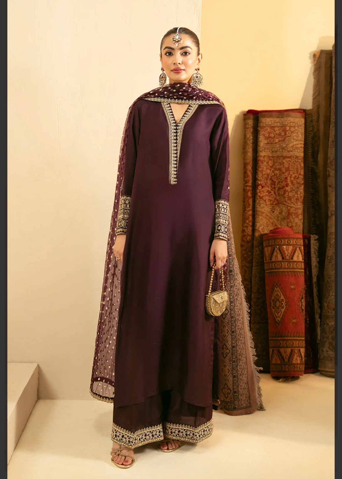 A timeless festive statement — this ensemble features a long shirt with an Indian V-neckline embellished with tila details, cuff sleeves embroidered with finesse, and flared trousers shimmering with sequined embroidery. An intricately bordered jacquard organza dupatta drapes gracefully to complete the look.