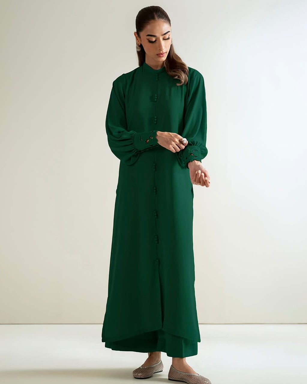 - Balloon cuff sleeves featuring cutwork embroidery and button detailing.