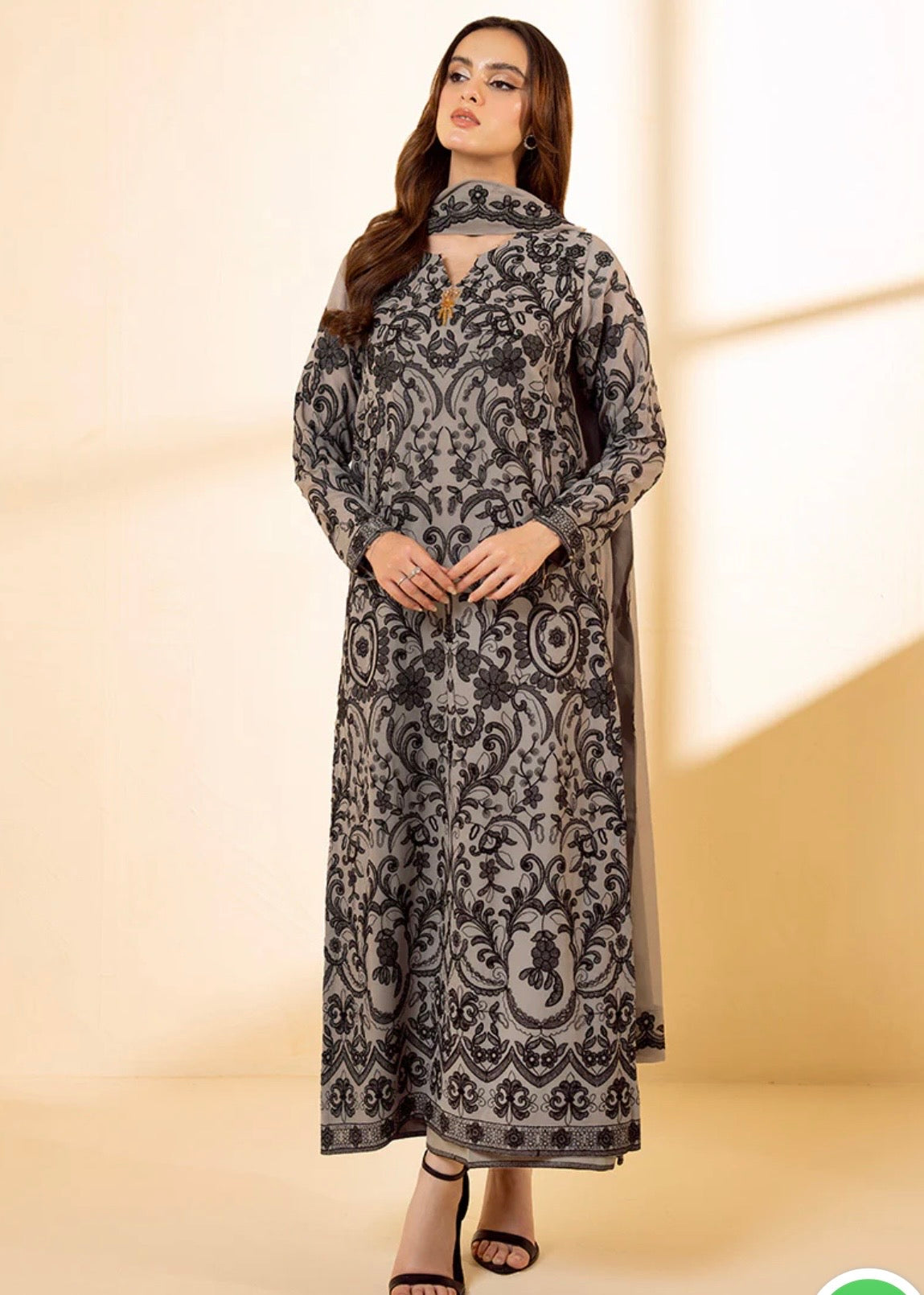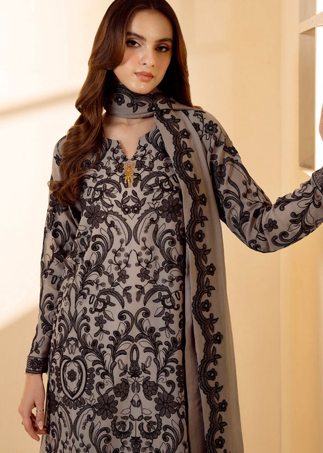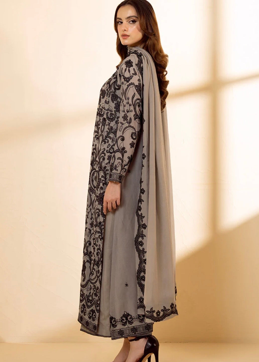 RSVP season redefined in elegance — this long shirt is beautifully detailed with contrast embroidery and delicate button accents along the neckline. Paired with flared trousers highlighted by an embroidered hem and a sheer chiffon dupatta adorned with a contrast embroidered border, it creates a true festive statement.