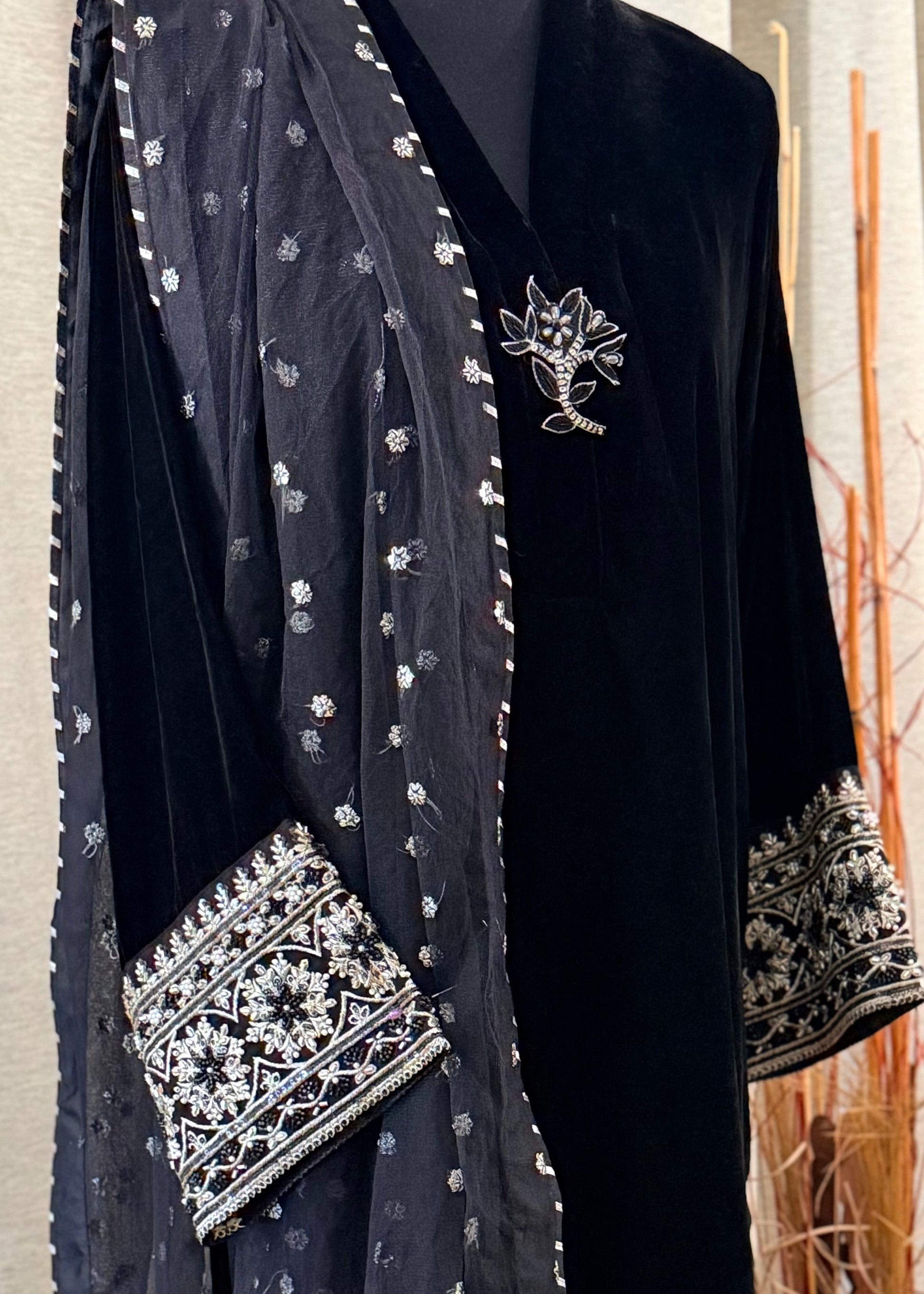 This black velvet suit is a timeless expression of understated luxury. Crafted in rich velvet, it features intricate black and silver detailing on the sleeves, adding a subtle yet striking contrast. The neckline is highlighted with a hand-made motif, carefully designed to elevate the ensemble with artisanal finesse. Perfect for evening occasions, this piece blends classic elegance with modern sophistication.