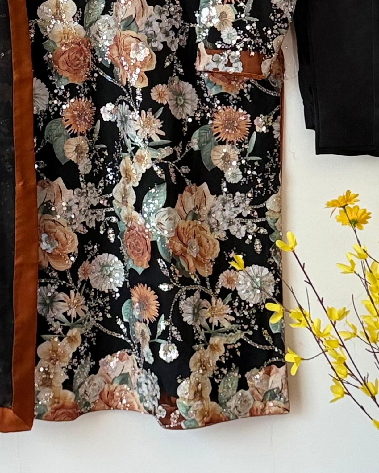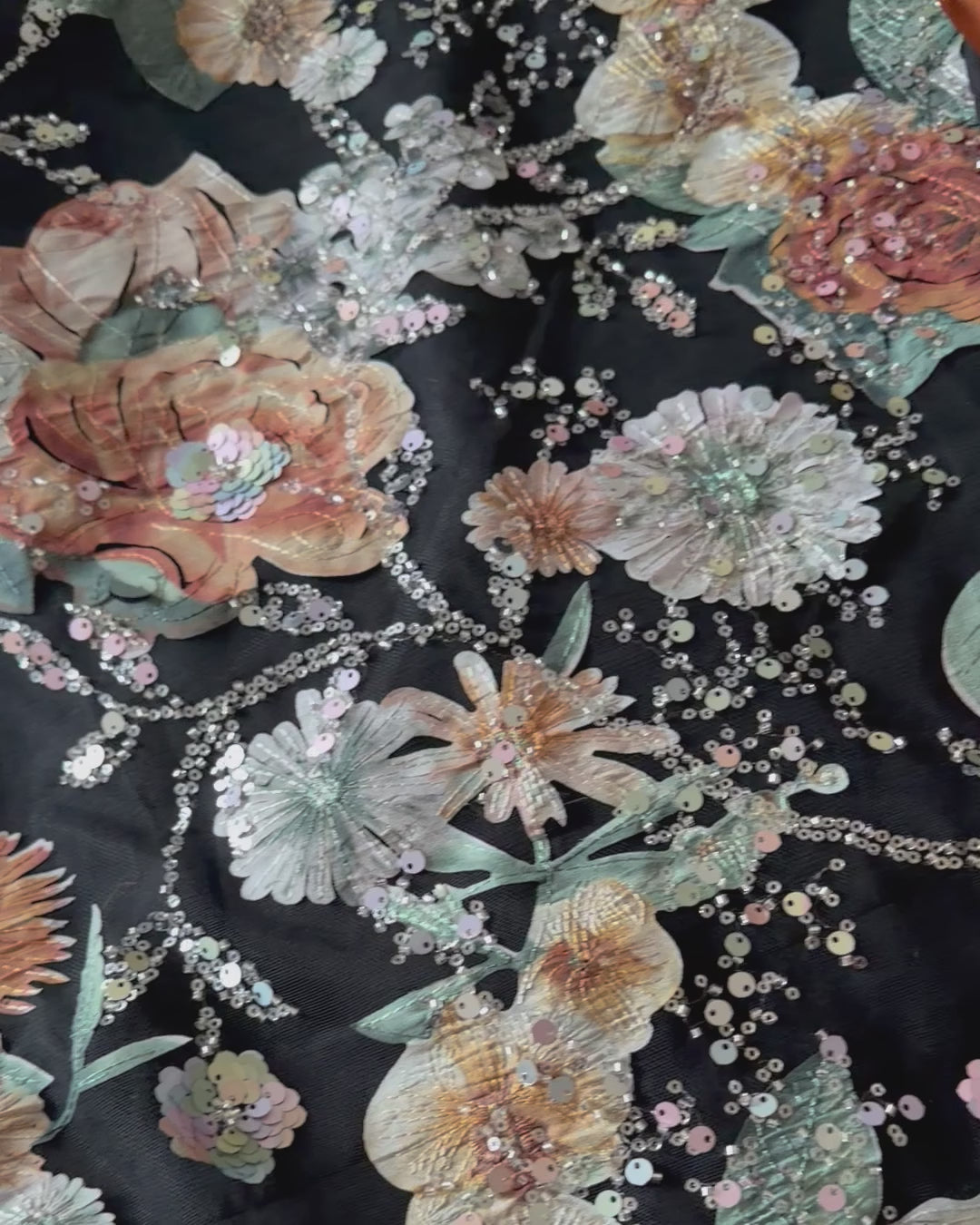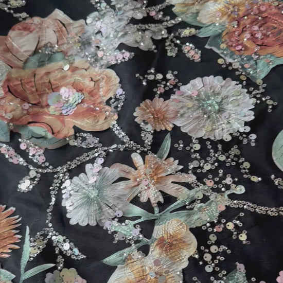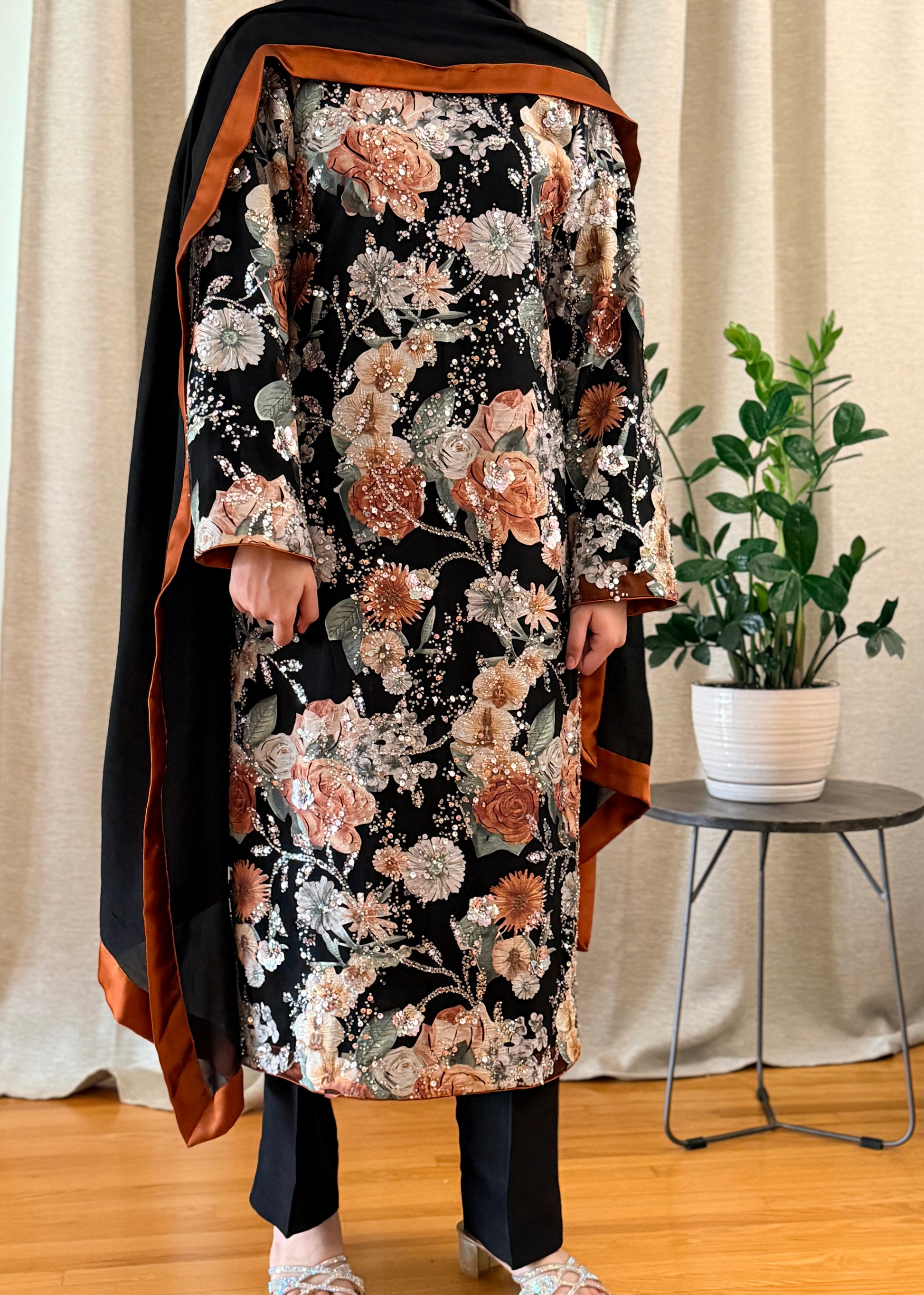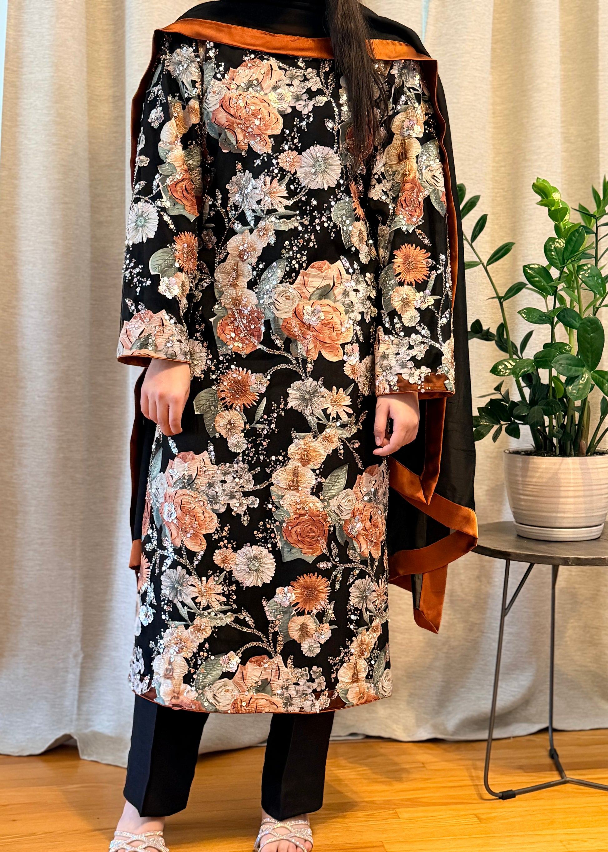 Crafted on luxurious soft net, this black dress features exquisite rust floral appliqué enhanced with fine embellishments, making it a perfect choice for any special occasion.