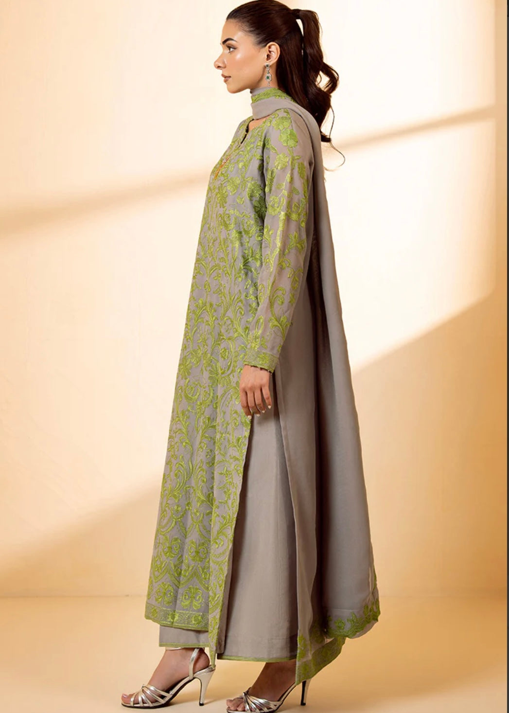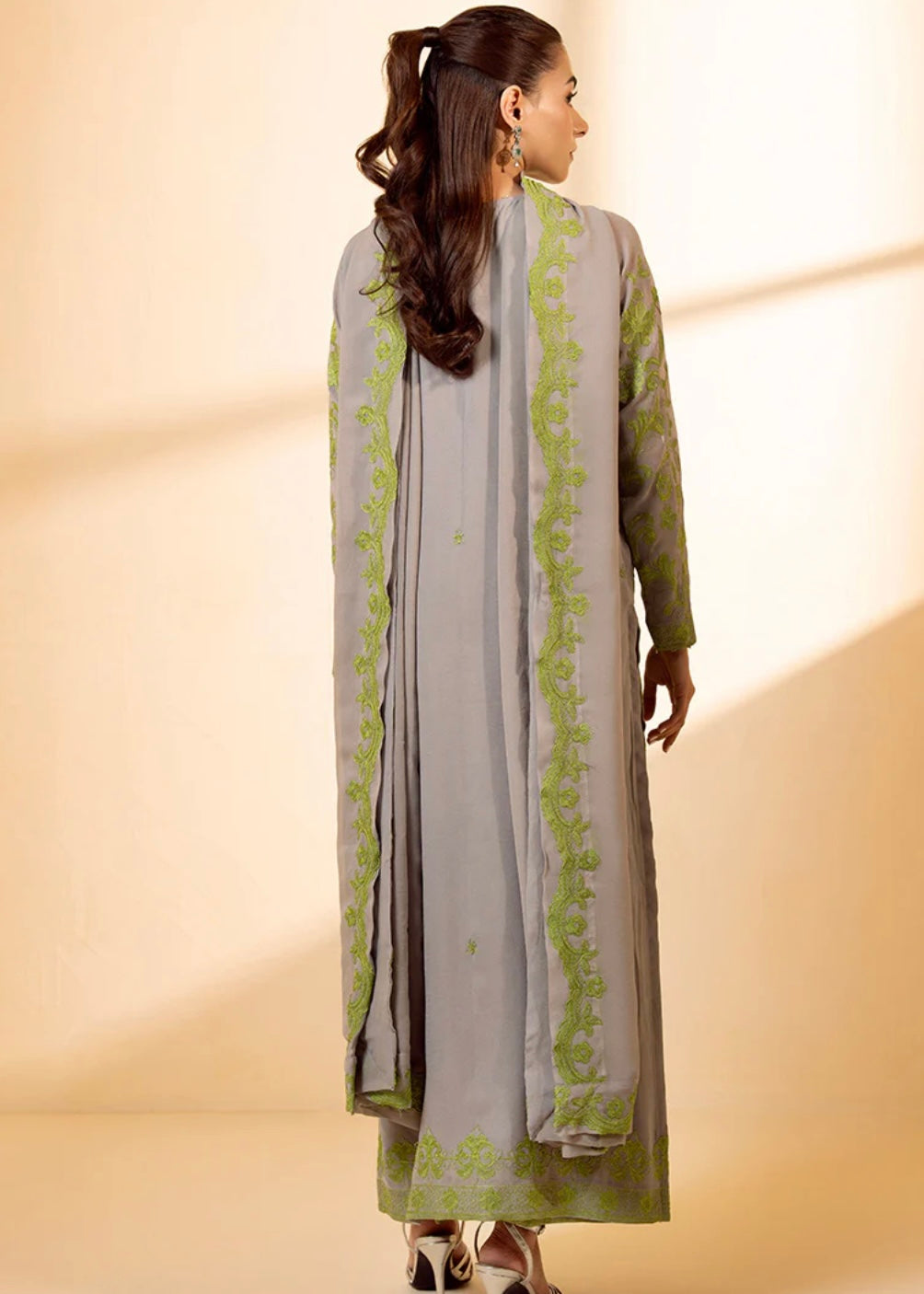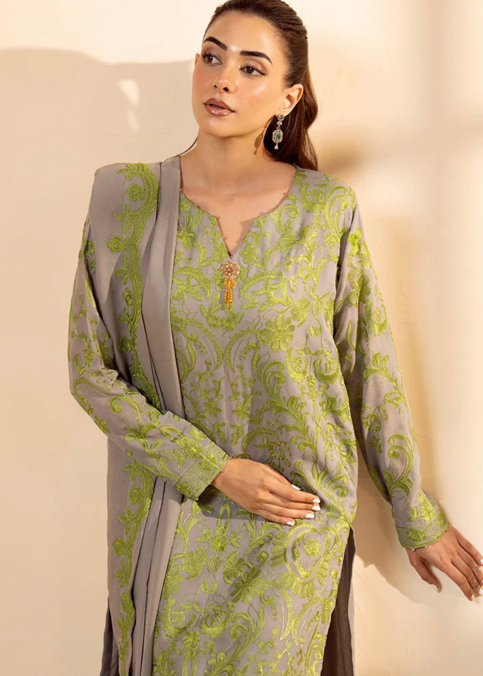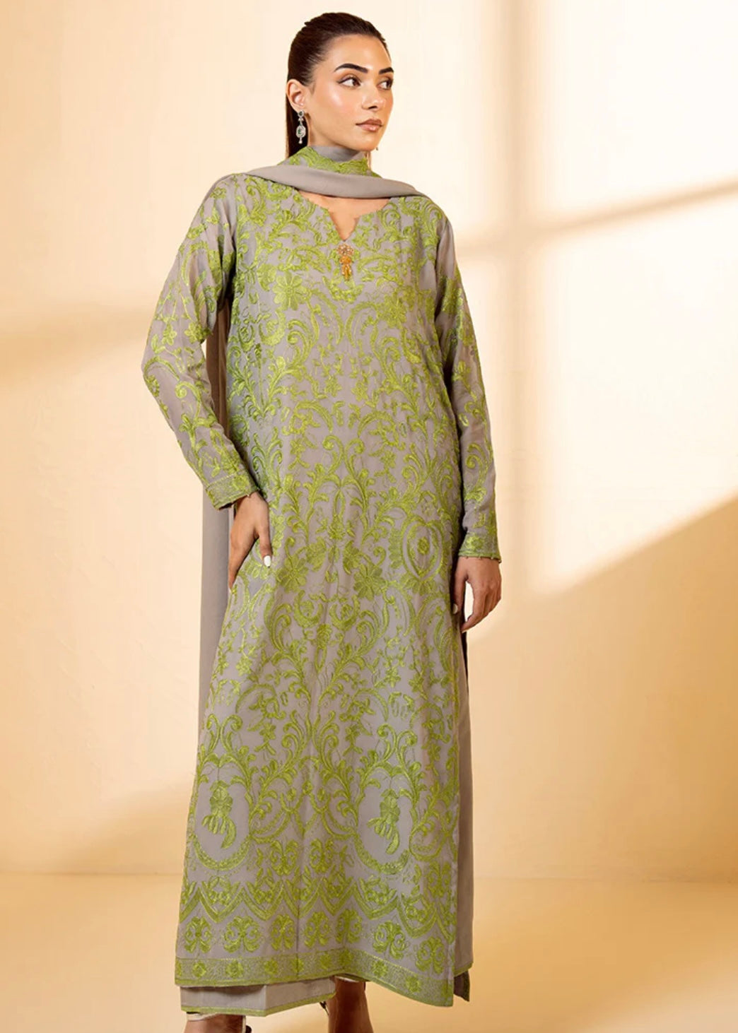 RSVP season redefined in elegance — this long shirt is beautifully detailed with contrast embroidery and delicate button accents along the neckline. Paired with flared trousers highlighted by an embroidered hem and a sheer chiffon dupatta adorned with a contrast embroidered border, it creates a true festive statement.