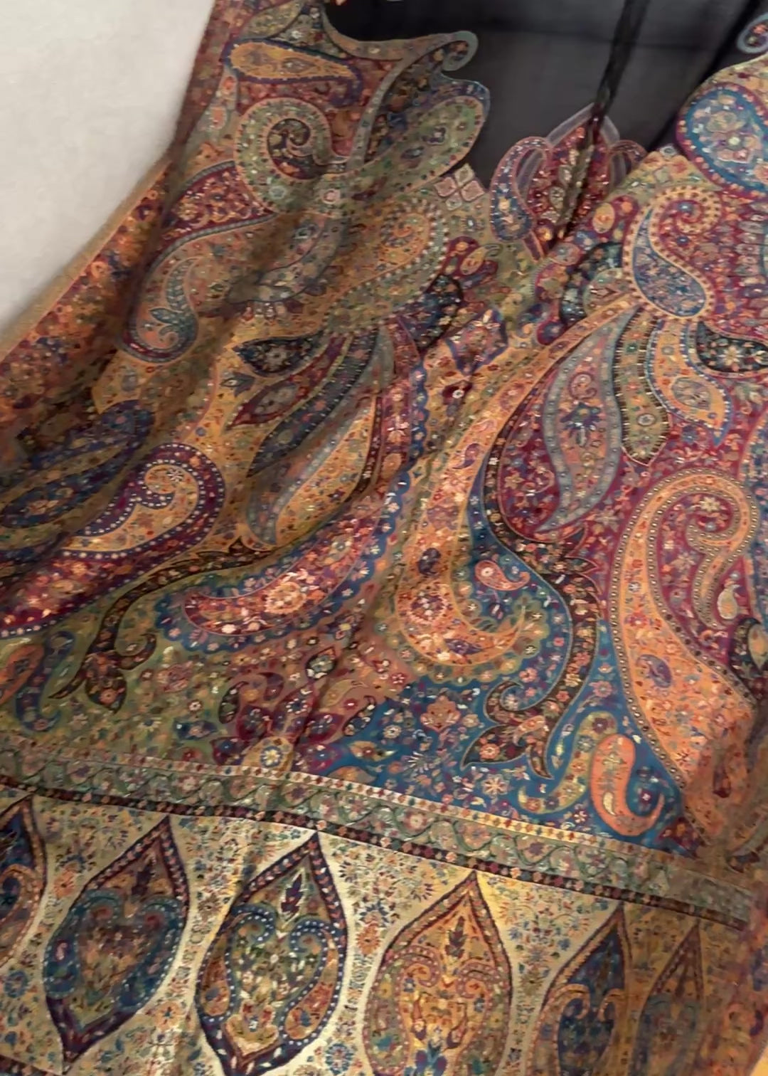 A masterpiece of heritage – intricate Kani patterns, shimmering zari, and the unmatched softness of Pashmina.