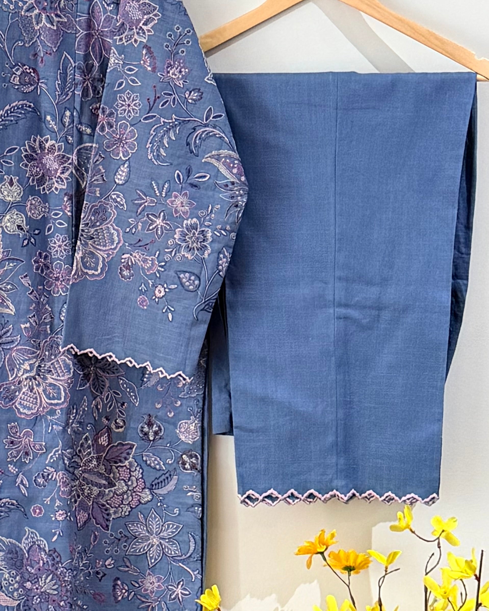 A marine blue khaddar shirt and trouser styled with a cerulean and blue shawl, a cool-toned harmony made for crisp winter days.