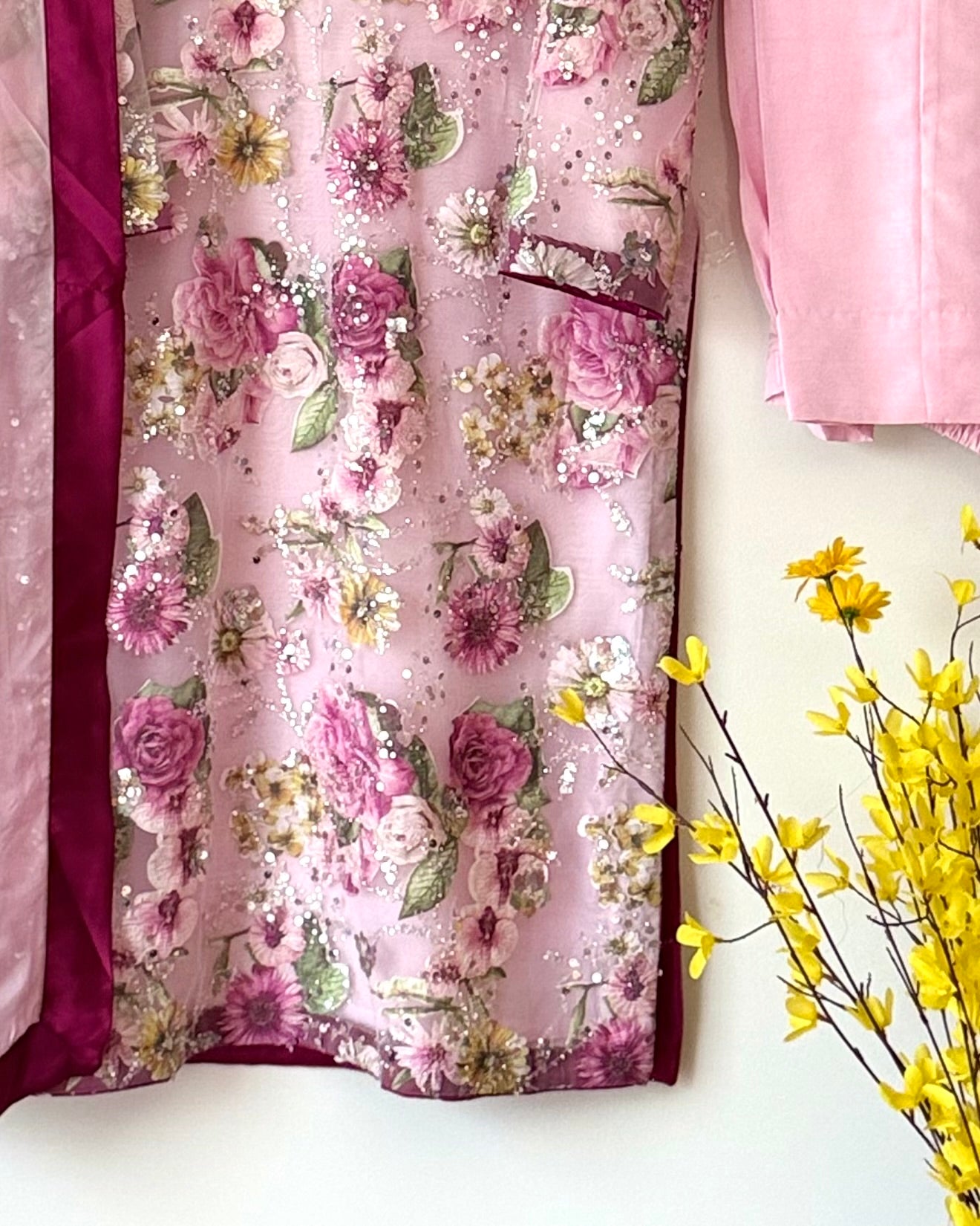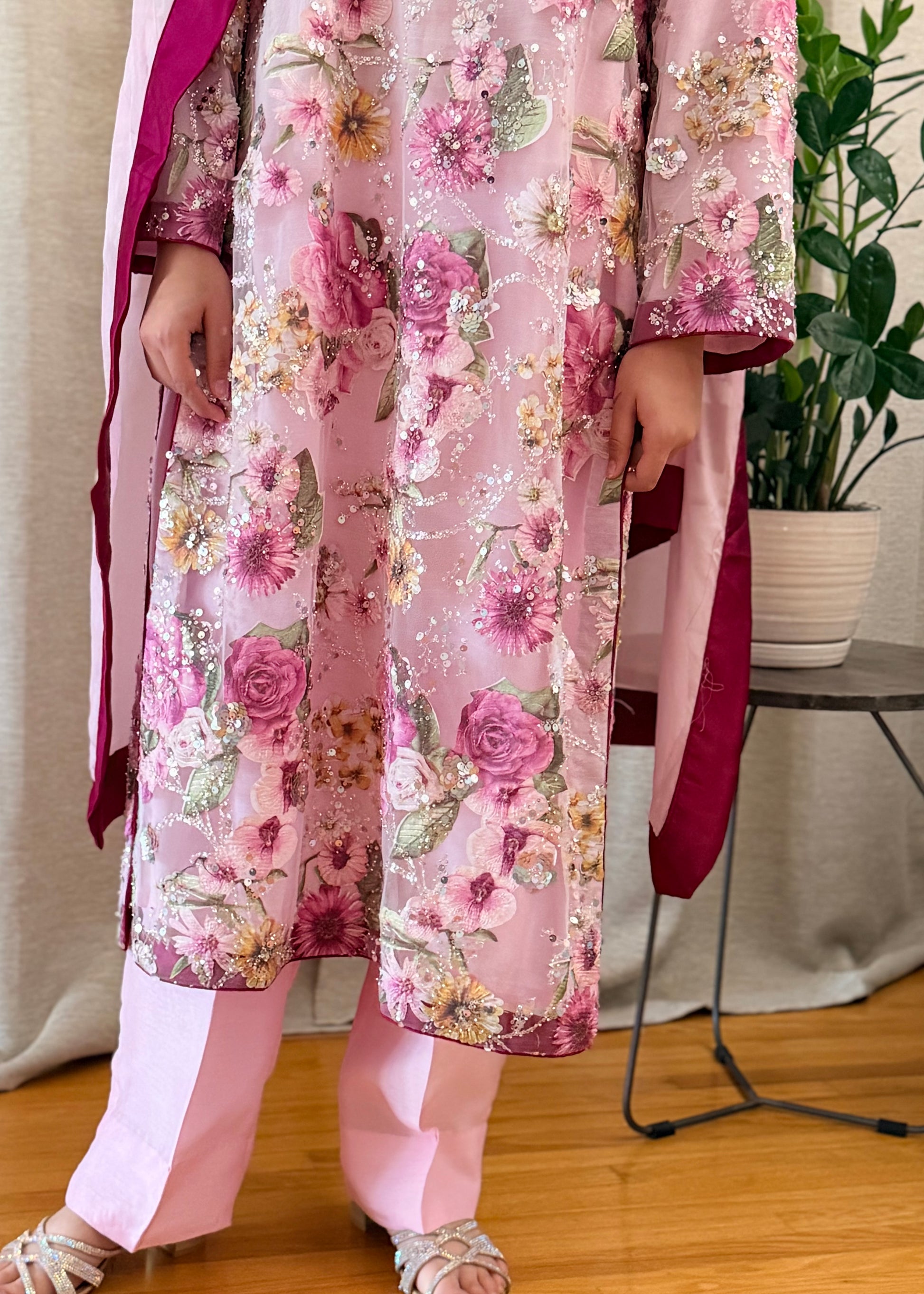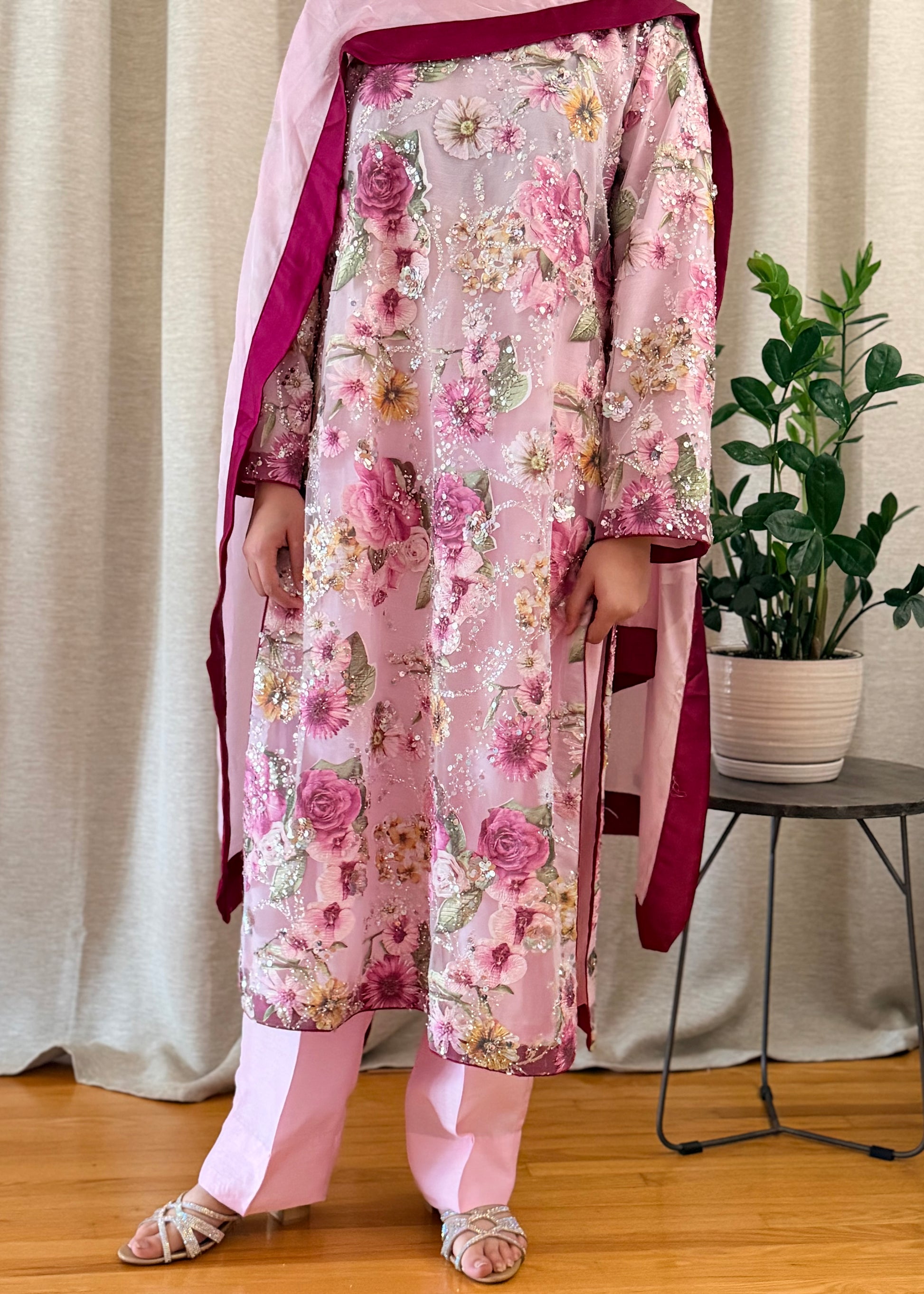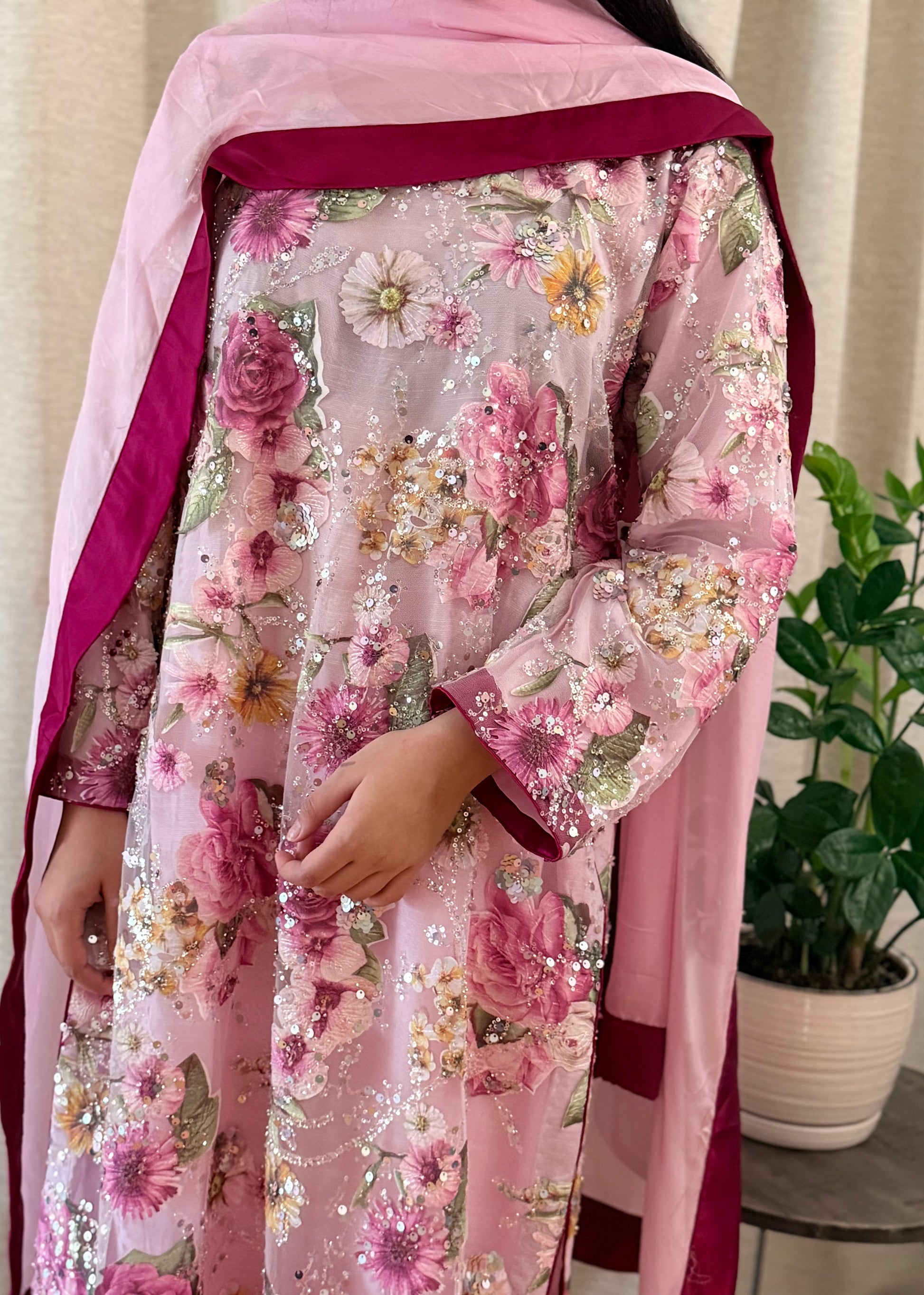 Elevate your festive elegance with this soft pink net ensemble, adorned with contrasting bright-pink silk appliqué and intricate hand-embellished sitara and beadwork. The delicate detailing adds a luxurious shimmer, creating a refined yet striking statement.